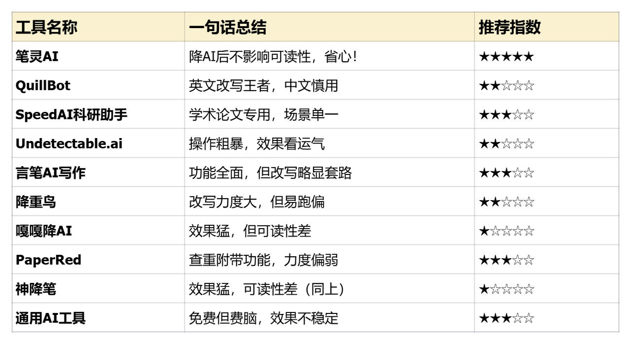 今天盘点的10款工具就到这。总的来说,没有完美的工具,选哪个得看你的具体需求。学生处理毕业论文降ai,那像笔灵AI这种能保留格式、风格不变的会更省心。如果是普通写手,想快速降低ai,可以试试其他几个国产工具。但切记,工具只是辅助,别指望它一步到位。