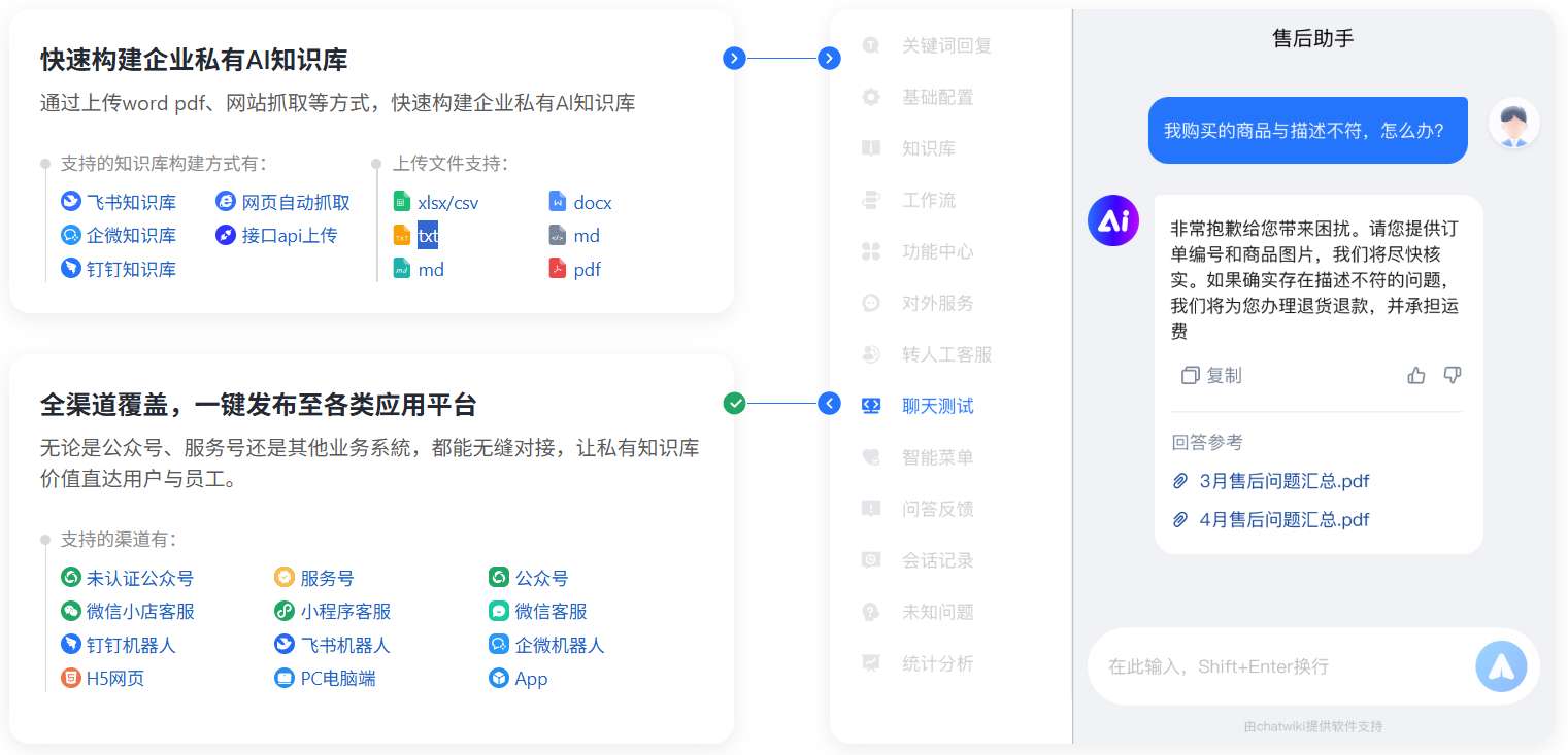 多种部署方式: 提供桌面客户端、支持发布为WebApp,支持嵌入网站、公众号服务号、微信客服、微信小店客服、钉钉机器人、飞书机器人等渠道。