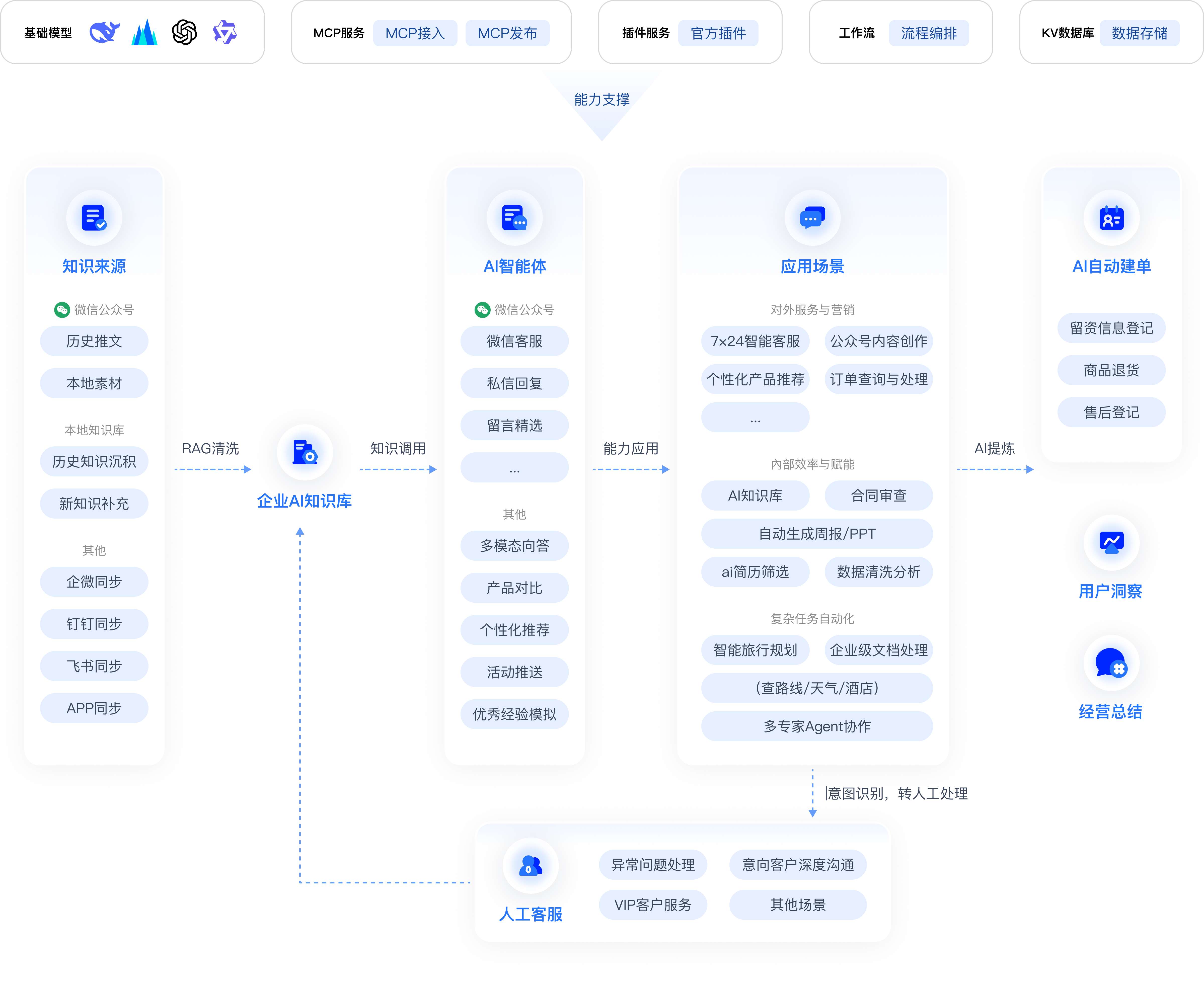 平台深度集成公众号开放能力,通过可视化拖拽即可快速搭建专属微信生态应用,让每个公众号都能一个超级AI智能体。