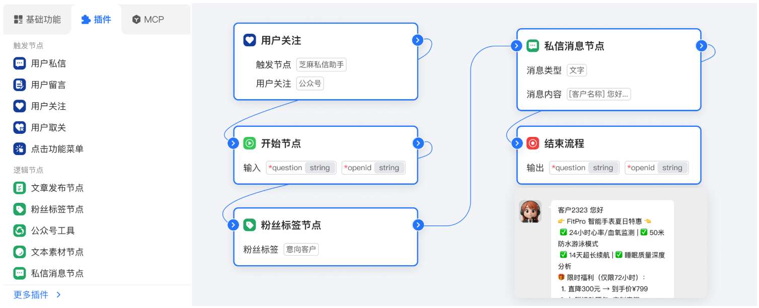 自定义微信工作流: 拖拽式可视化操作,无需代码即可搭建个性化工作流,对接公众号各类开放能力,满足多样化自动化业务需求。