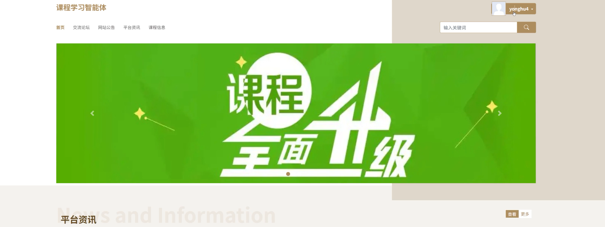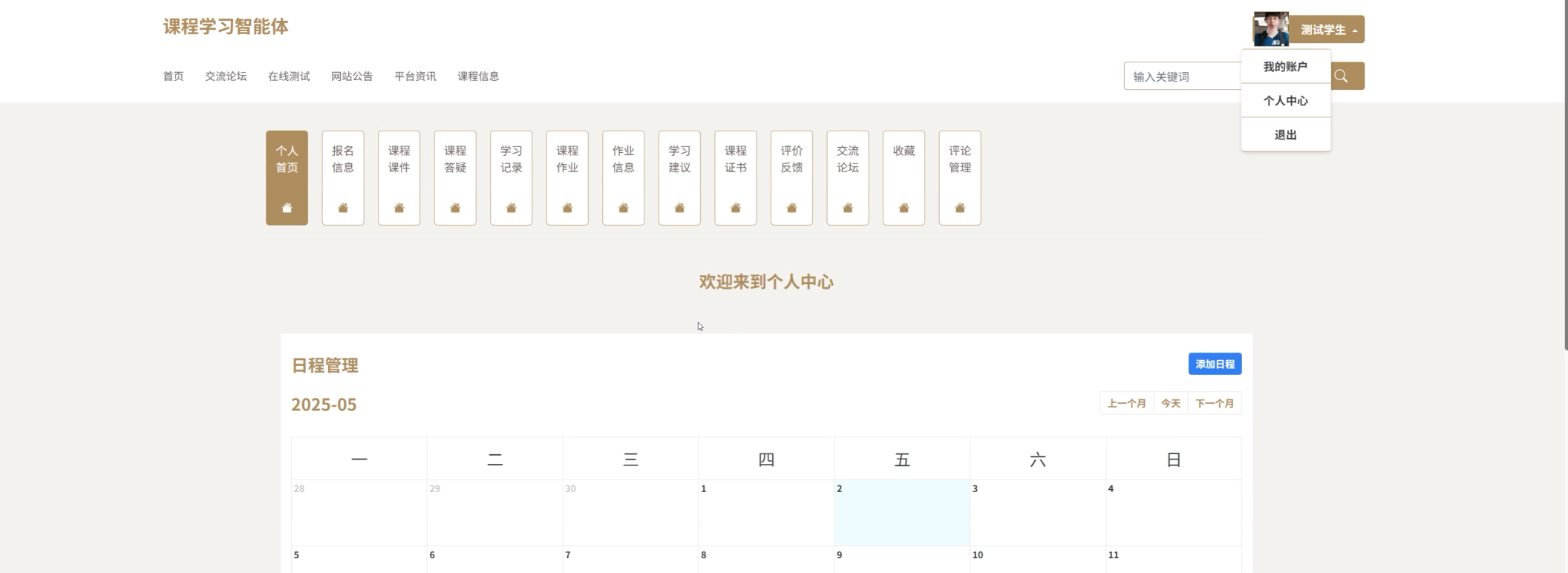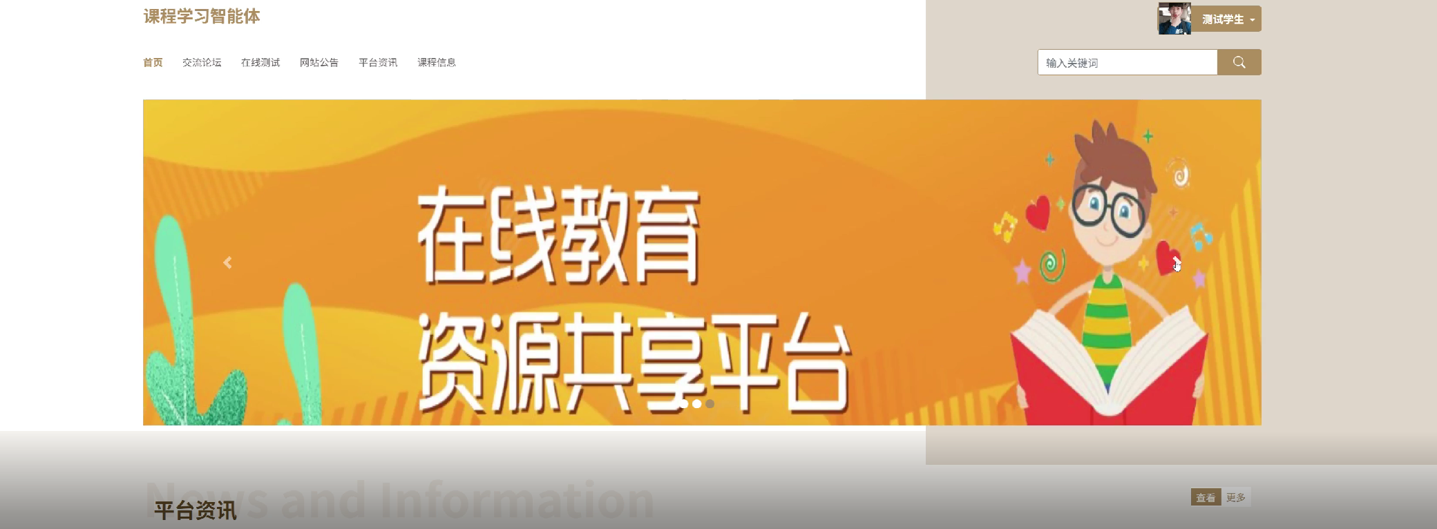学生用户登录课程学习智能体平台后,在首页界面,能浏览交流论坛、在线测试、网站公告、平台资讯、课程信息等信息,学生用户首页界面如下图所示。