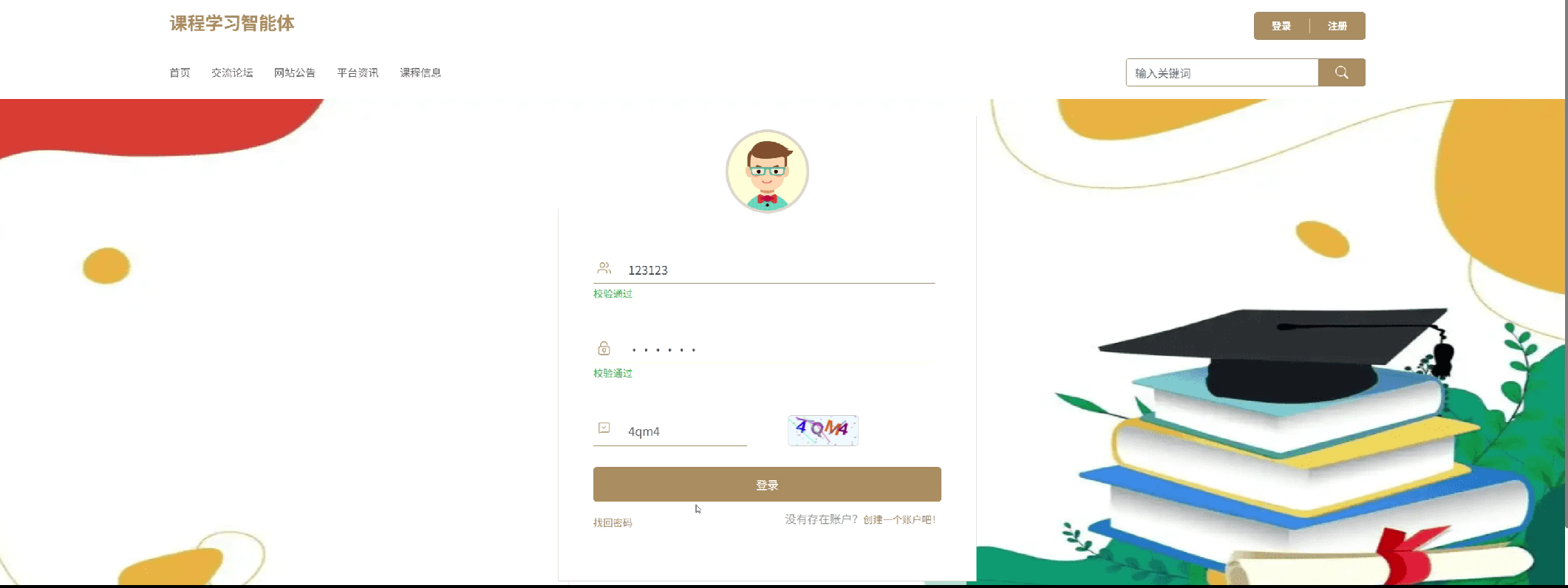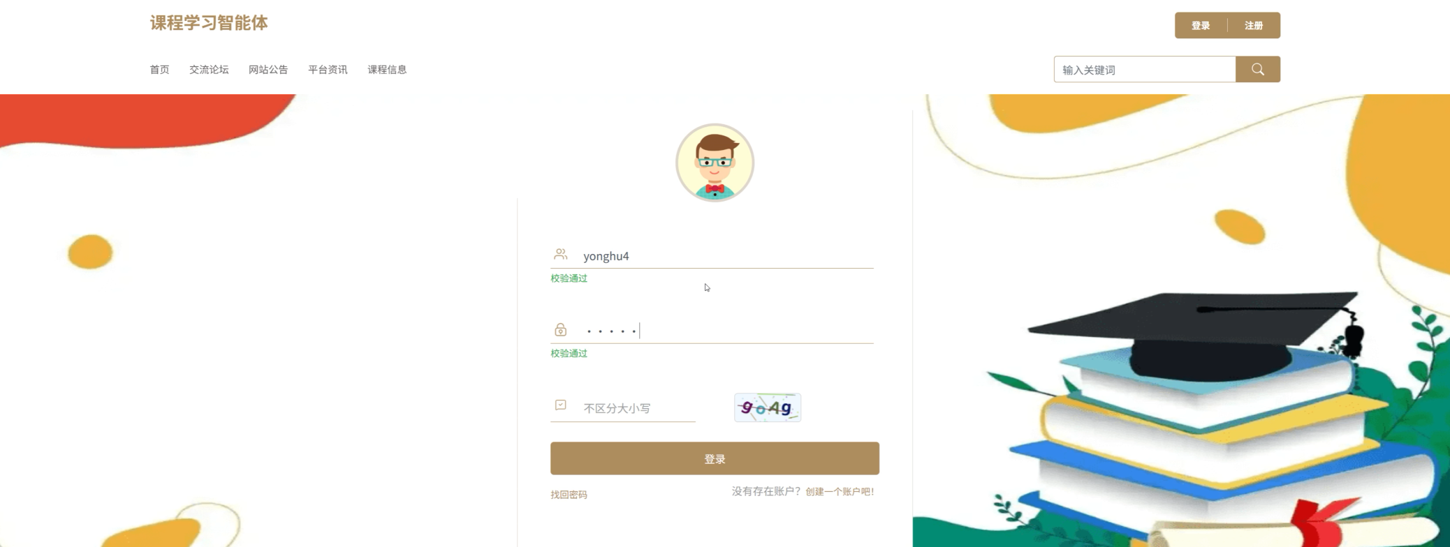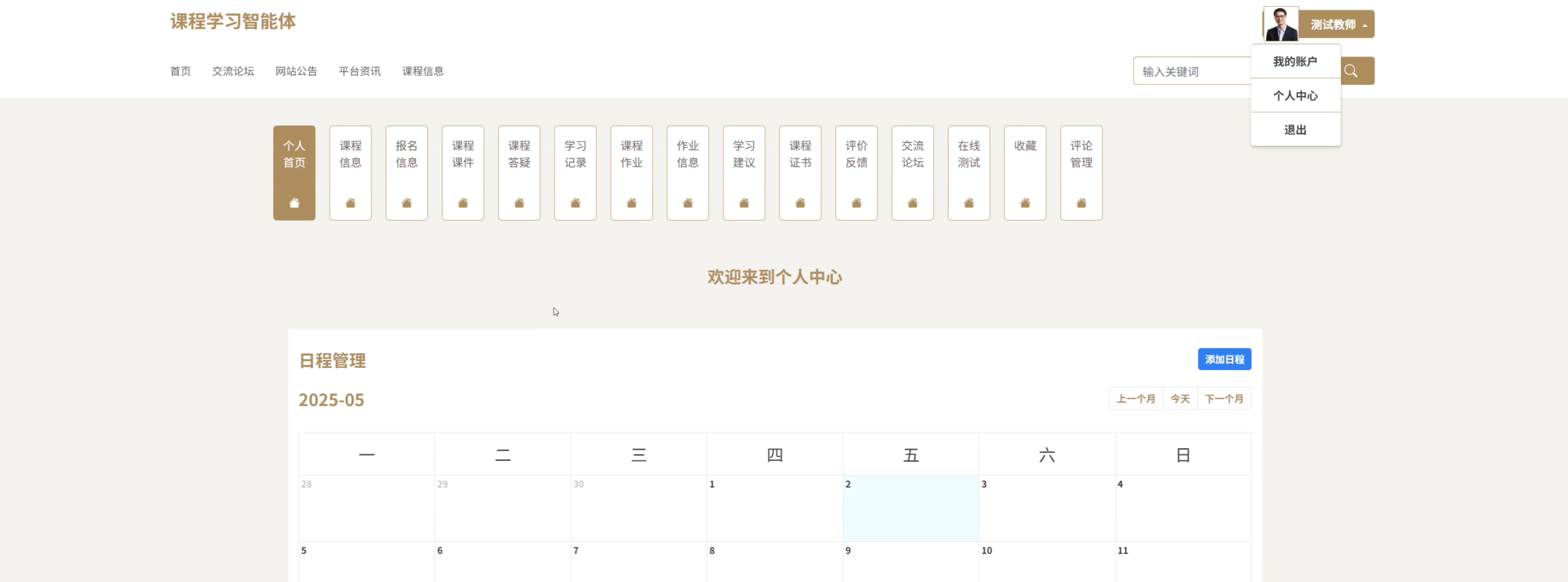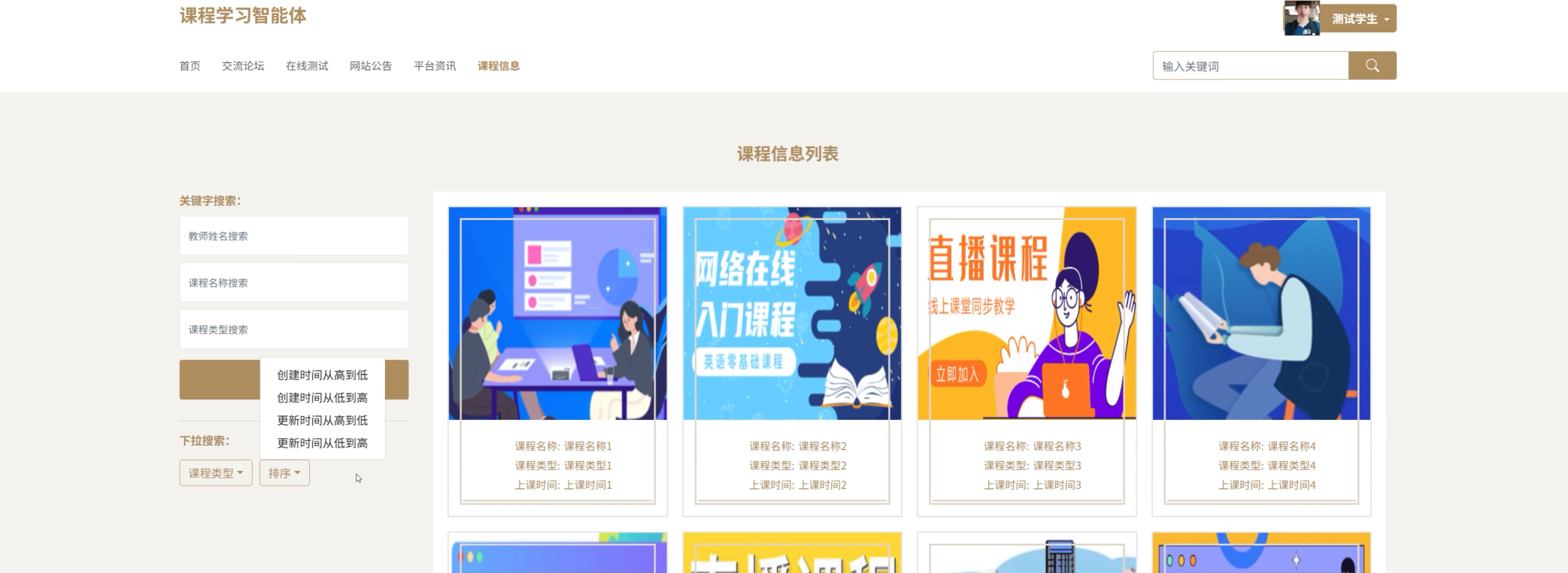 学生用户登录课程学习智能体平台后,在首页界面,能浏览交流论坛、在线测试、网站公告、平台资讯、课程信息等信息,学生用户首页界面如下图所示。