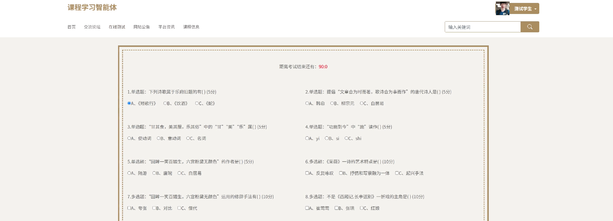 学生用户点击进入在线测试功能,可以参加平台提供的自我评估测验以检验学习效果。在线测试界面如下图所示。
