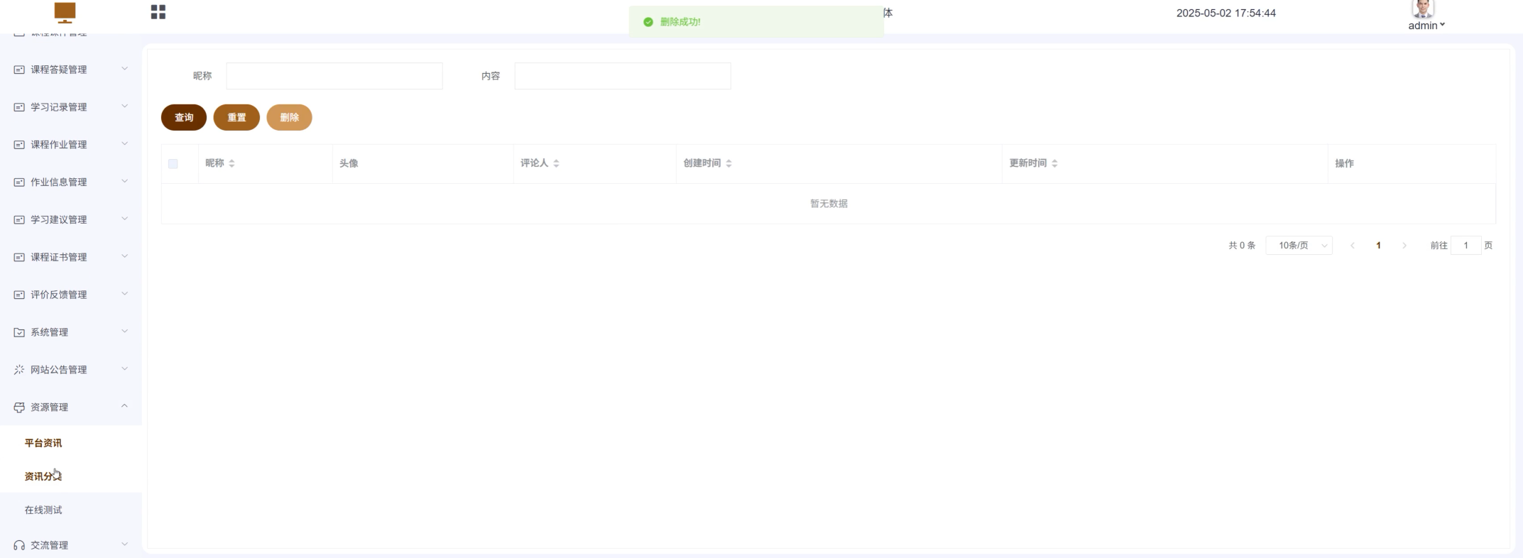 管理员点击系统管理,可以管理平台资讯,发布学习相关的新闻、文章。进行资讯分类,组织和管理资讯所属的分类标签。管理在线测试,创建和管理在线测验题库及试卷。资源管理界面如下图所示。