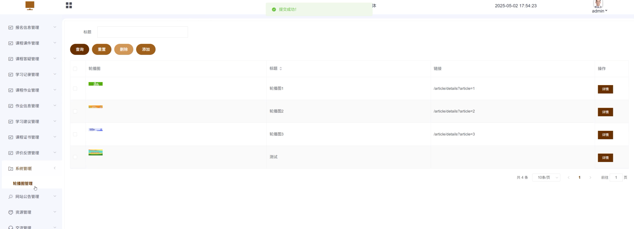 管理员点击系统管理,可以管理轮播图的设计与发布,上传图片,确保关键信息的展示。系统管理界面如下图所示。