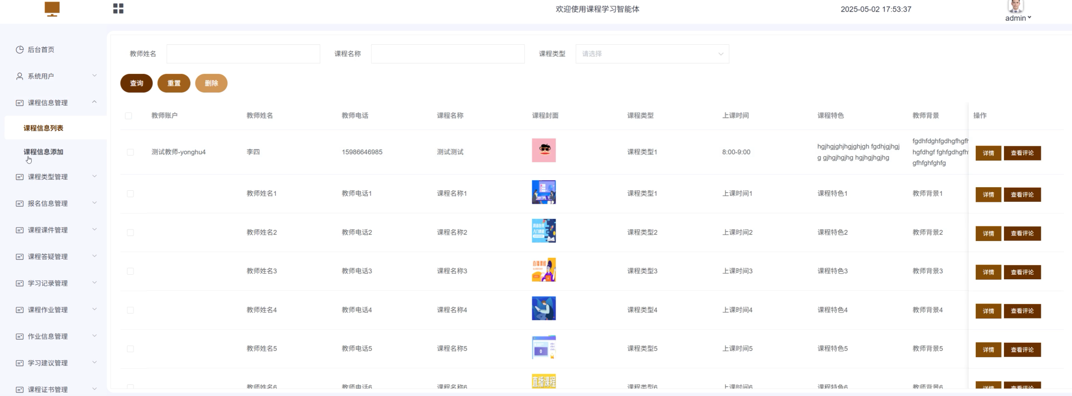 管理员进入系统后台点击课程信息管理,可以添加、编辑和管理课程基础信息。课程信息管理界面如下图所示。