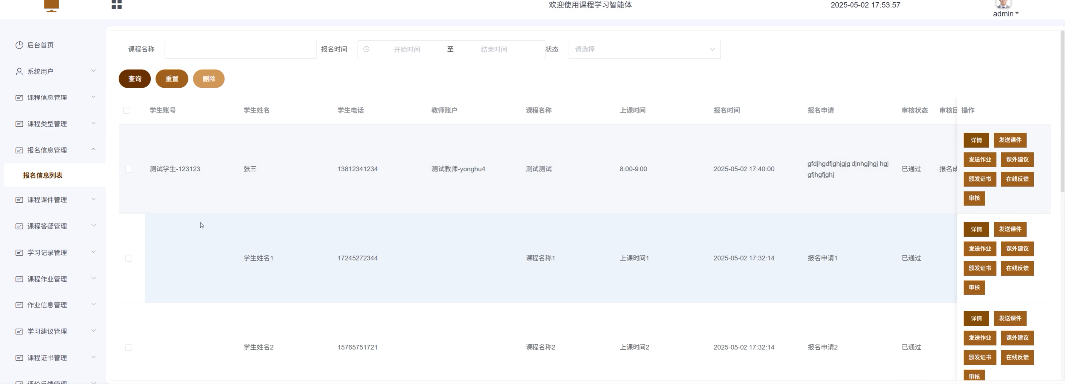 管理员进入系统后台点击报名信息管理,可以跟踪并管理学生的课程报名情况。报名信息管理界面如下图所示。