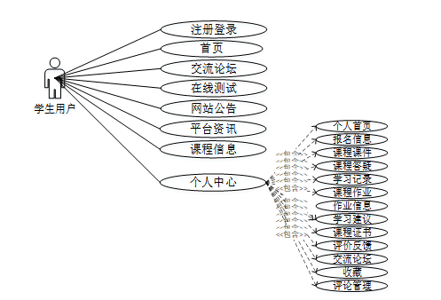 学生用户点击进入个人中心,可以实现以下功能:个人首页、报名信息、课程课件、课程答疑、学习记录、课程作业、作业信息、学习建议、课程证书、评价反馈、交流论坛、收藏、评论管理。学生用户个人中心息界面如下图所示。