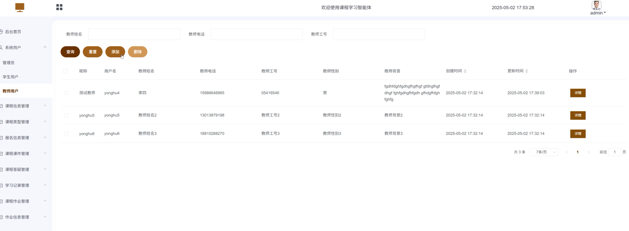 (5)课程信息:查看和维护所负责课程的基本信息,添加或更新课程内容。
