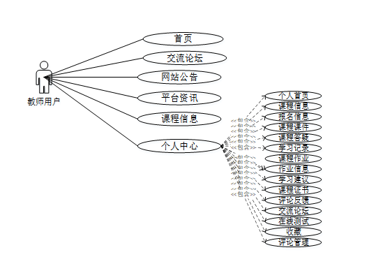 教师用户点击进入个人中心,可以实现以下功能:个人首页、课程信息,报名信息、课程课件、课程答疑、学习记录、课程作业、作业信息、学习建议、课程证书、评价反馈、交流论坛、在线测试、收藏,评论管理。教师用户个人中心息界面如下图所示。