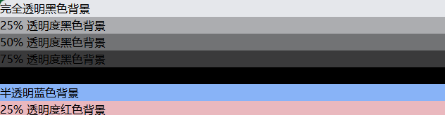 <div class="bg-black/25">25% 透明度黑色背景</div>