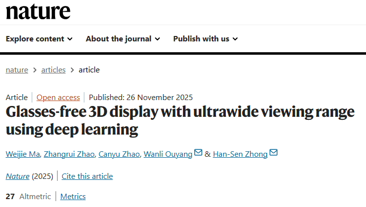 重磅突破! 北京时间11月27日,国际顶尖学术期刊《Nature》以正刊形式,发表了来自复旦大学的最新研究成果。年仅26岁的计算与智能创新学院二年级博士研究生马炜杰,作为独立第一作者,提出了一种基于深度学习的颠覆性裸眼3D显示方案——EyeReal。