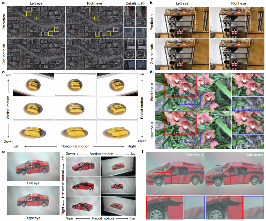 - 可学习相位分解网络: 接着,设计了一个轻量级全卷积神经网络。该网络能根据双眼的位置,实时计算出如何调控光线,从而在观察者眼中形成立体图像。整个过程在单张NVIDIA RTX 4090显卡上能达到50.2Hz的刷新率,实现了流畅的动态显示。