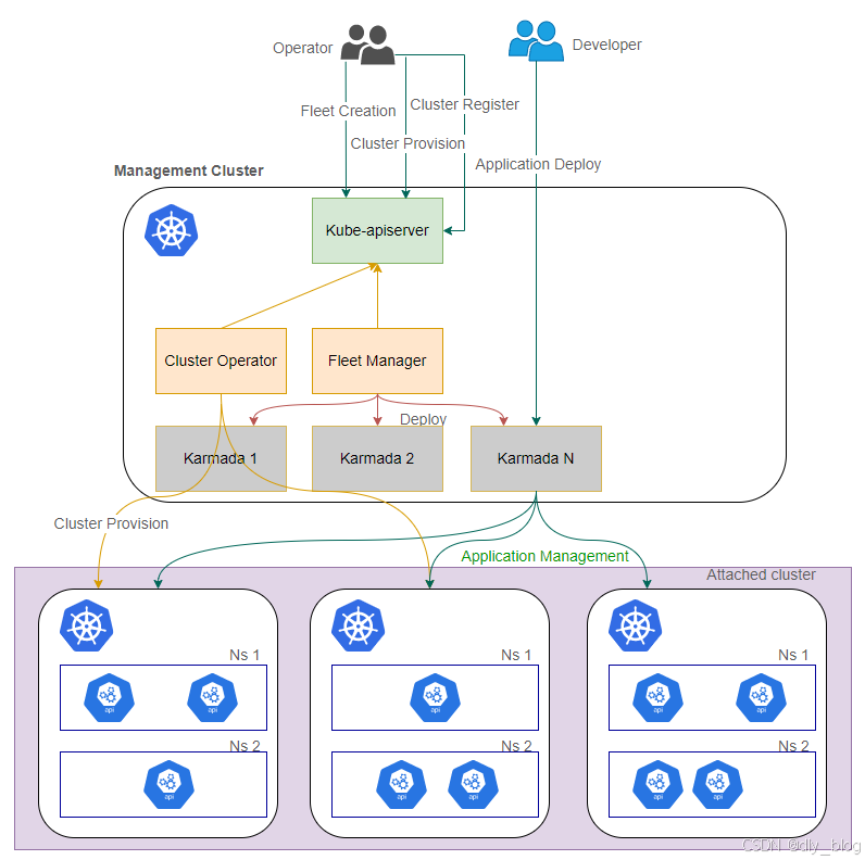 - 管理集群(host):部署 Fleet Manager、统一监控控制面