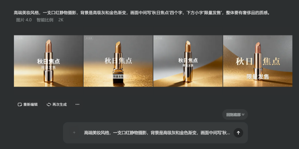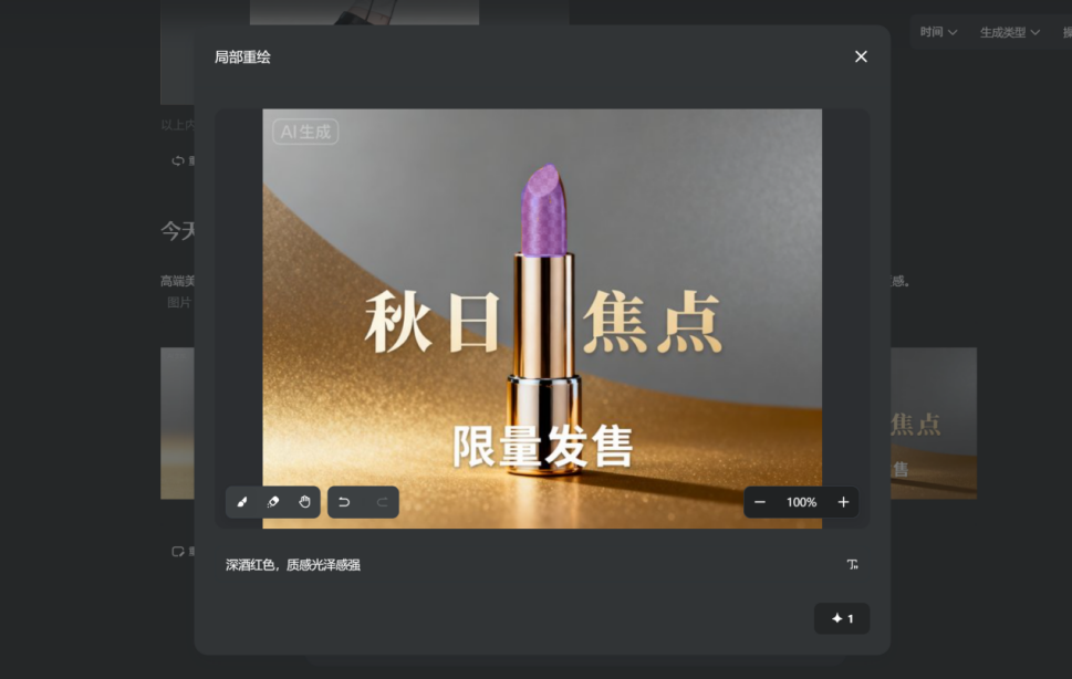 甲方说"口红的颜色需要更深一点,更显气质"?别重画!用即梦的"局部重绘",圈选口红部分,输入"深酒红色,质感光泽感强"