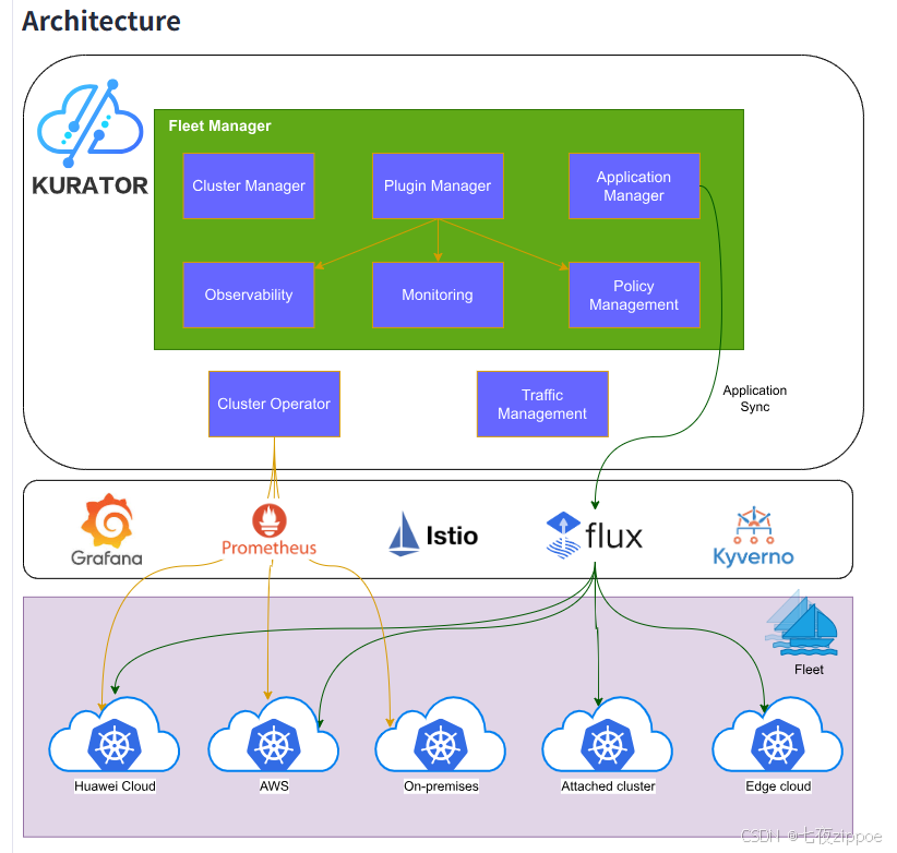 Kurator的设计理念可概括为"整合优于重构,抽象高于实现"。它不是重复造轮子,而是将Istio、Karmada、Prometheus等主流云原生项目有机整合,形成统一的控制平面。