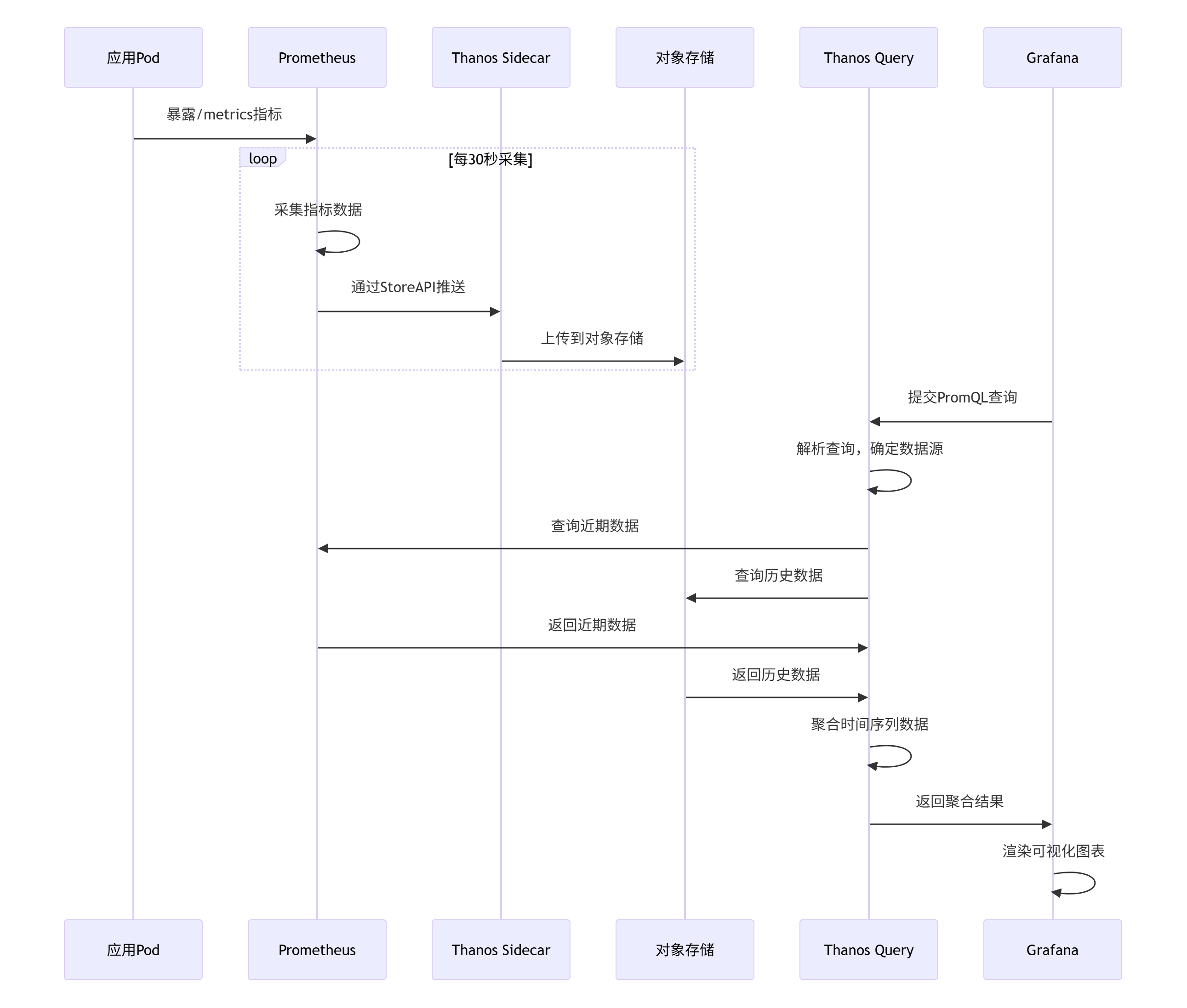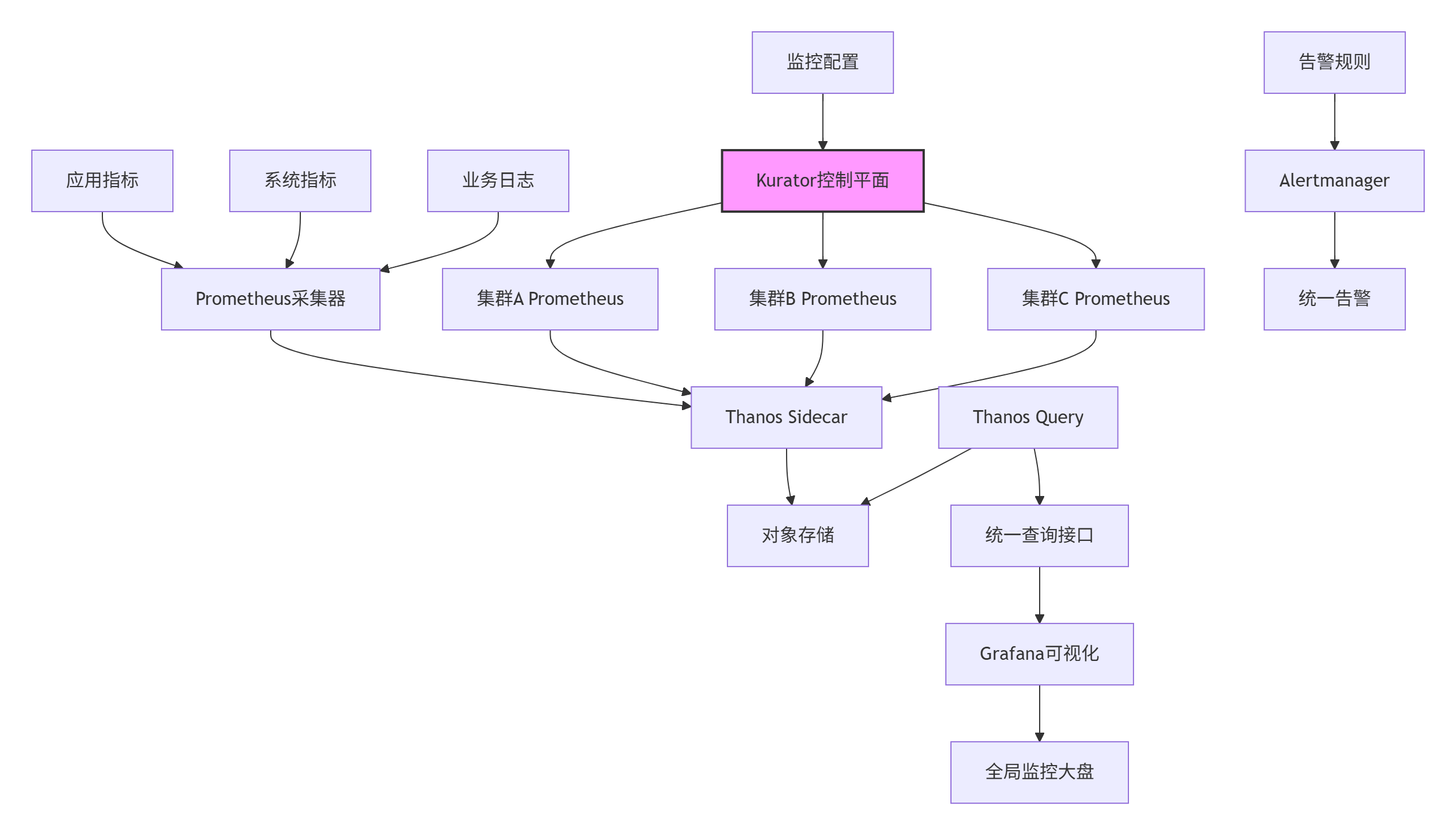 查询层:Thanos Query组件提供全局查询接口,聚合所有集群的监控数据,提供透明的查询路由和聚合能力