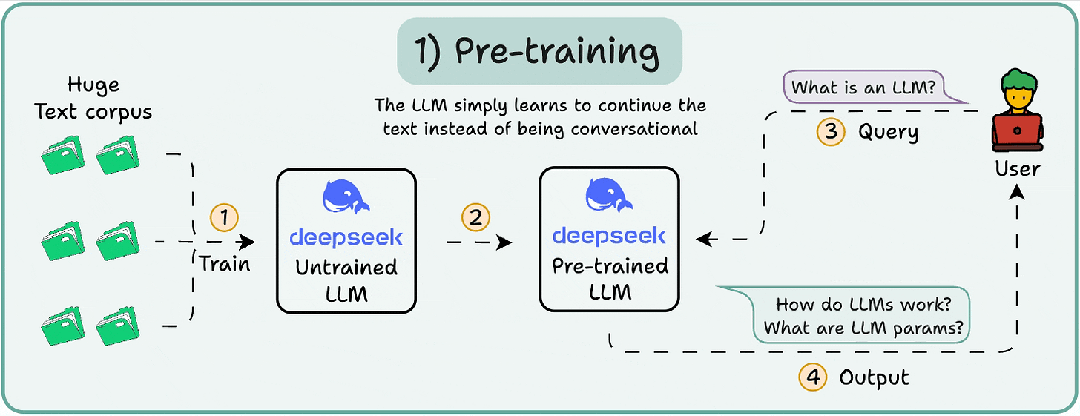 这个阶段通过训练语言学习模型(LLM)使用海量语料库来预测下一个词元,从而教会它语言的基础知识。这样,它就能吸收语法、世界知识等等。但它不擅长对话,因为当被问及时,它只会继续发送文本。