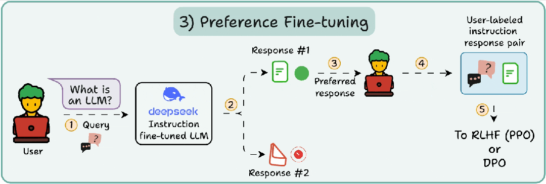 这不仅可以用于收集反馈,而且是宝贵的人类偏好数据。OpenAI 利用这种特性,通过偏好微调来微调其模型。在 PFT 中:用户在两种答案中做出选择,以生成人类偏好数据。然后训练奖励模型来预测人类偏好,并使用强化学习更新 LLM。
