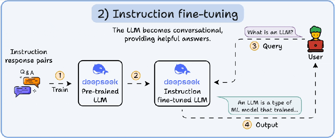 为了使其更像对话,我们通过训练指令-反应对(Instruction-Response Pair)来进行指令微调。这有助于它学习如何遵循提示并正确回复。
