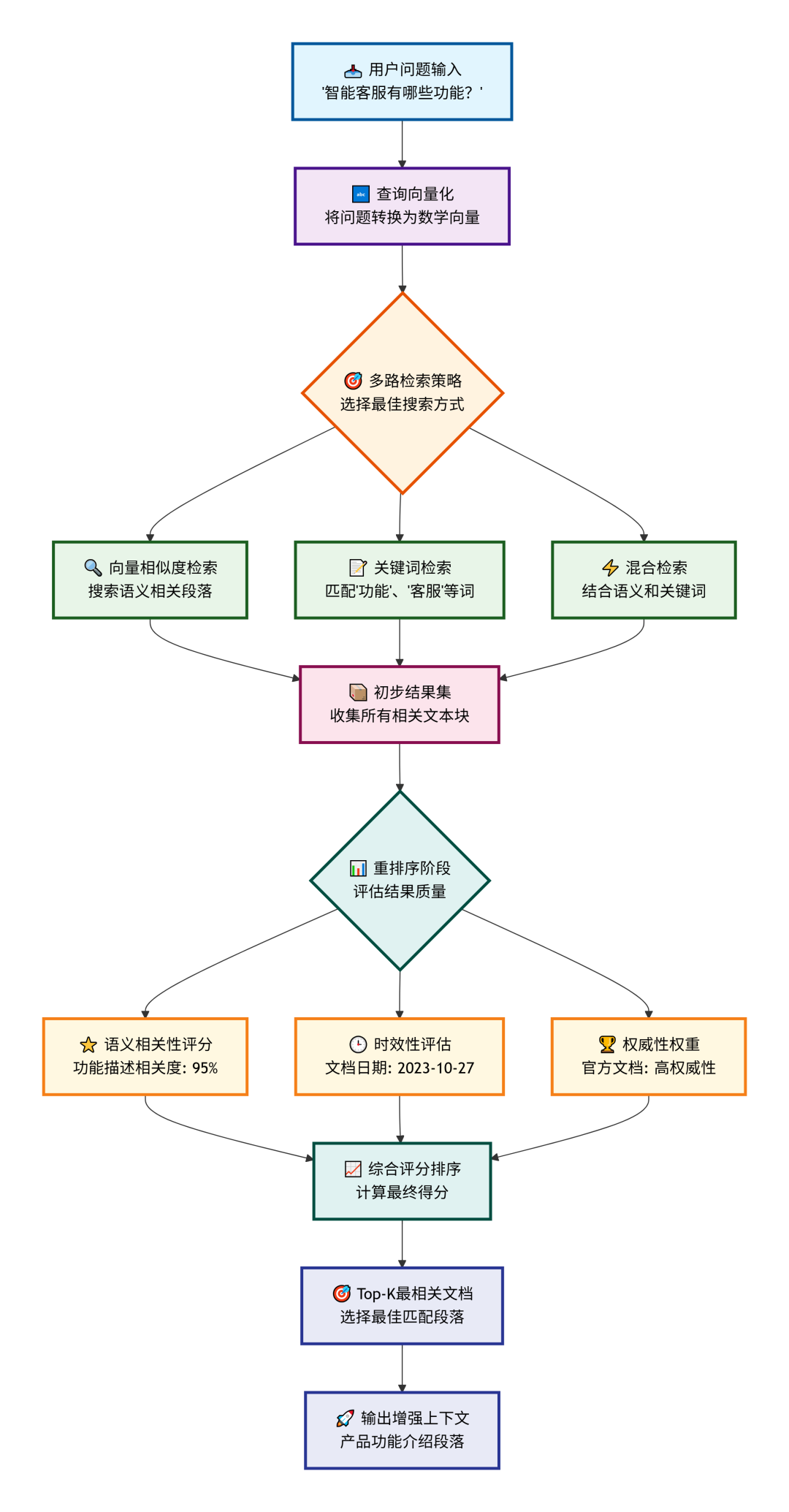 基于这份"智能客服解决方案商业计划书"文档内容,我来详细说明RAG检索流程图中各阶段如何工作的?