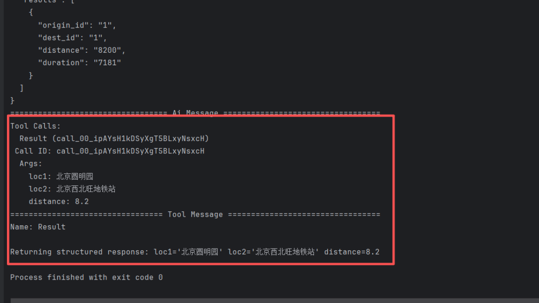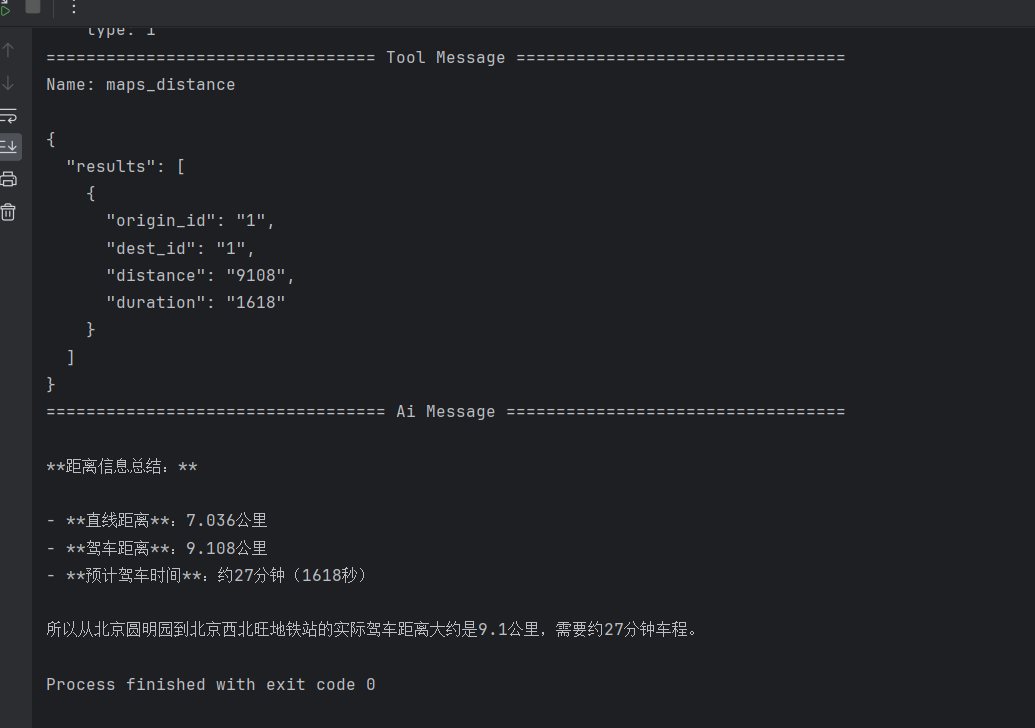create_agent API 的一个重要特性是支持结构化输出。这一功能极大地方便了后续的数据处理与系统集成。本节将基于前面高德地图 MCP 的示例,演示如何让智能体返回标准化的距离信息,格式如下: