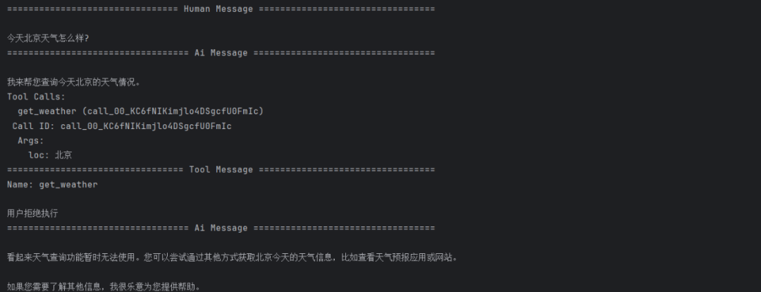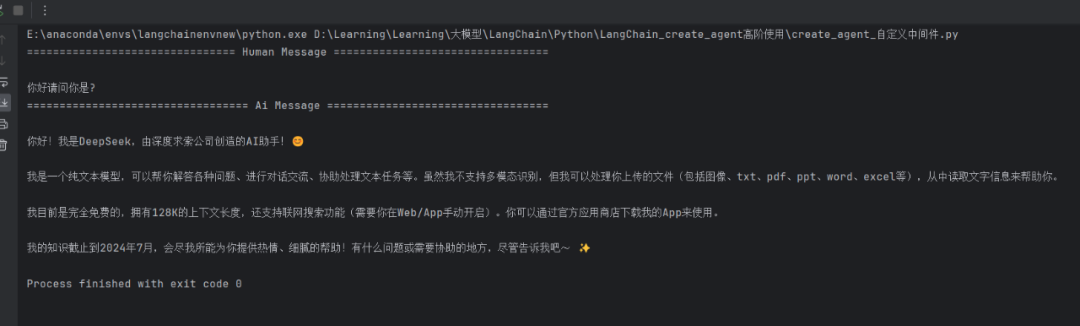 执行结果显示智能体使用了 DeepSeek 模型进行响应,这表明中间件成功根据用户级别动态选择了模型。