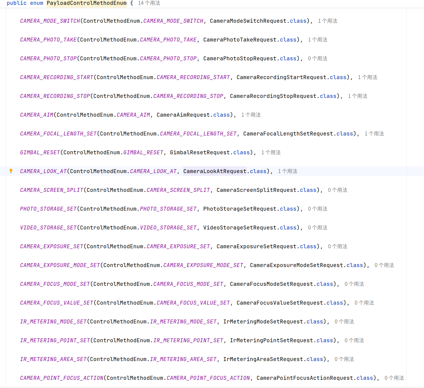 但是,如下图所示,cloud_api_sample_docker/cloud_api_sample/source/backend_service/sample/src/main/java/com/dji/sample/control/model/enums/PayloadCommandsEnum.java是大疆实际给出的实现方法,我们发现,最重要的云台控制方法,look_at函数没有给出实现,不只是一个,而是look_at之后的所有功能都没有实现。