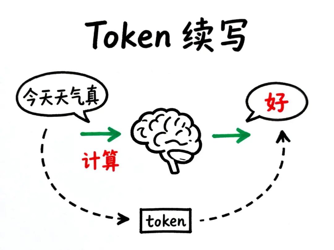 举个例子,当你输入"今天天气真"时,大模型会计算出最可能的下一个Token是"好"。然后把"今天天气真好"重新输入,再算出下一个可能是"啊"。就这样一个Token接一个Token地续写,最终输出一段完整的回答。