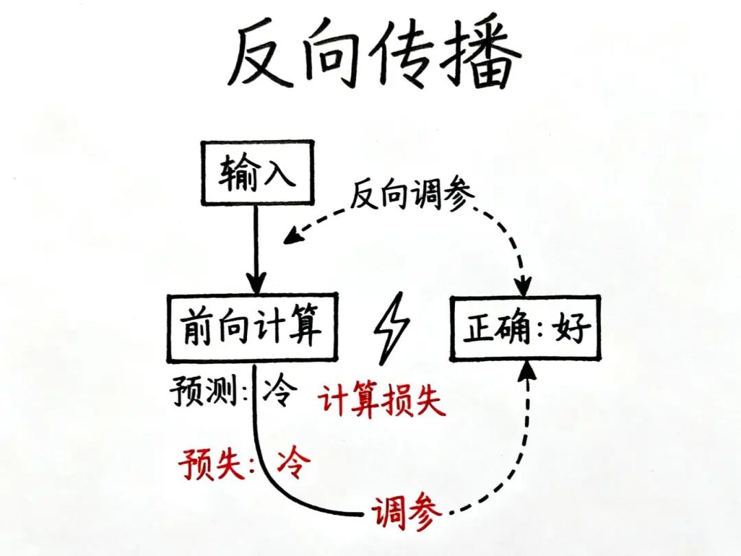 想象一下,你给模型输入"今天天气真",它预测下一个Token是"冷"。但正确答案应该是"好"。这时候,模型会计算预测结果和正确答案之间的损失(Loss),然后反向追溯:哪个计算环节出了问题?该如何调整参数才能得到正确答案?