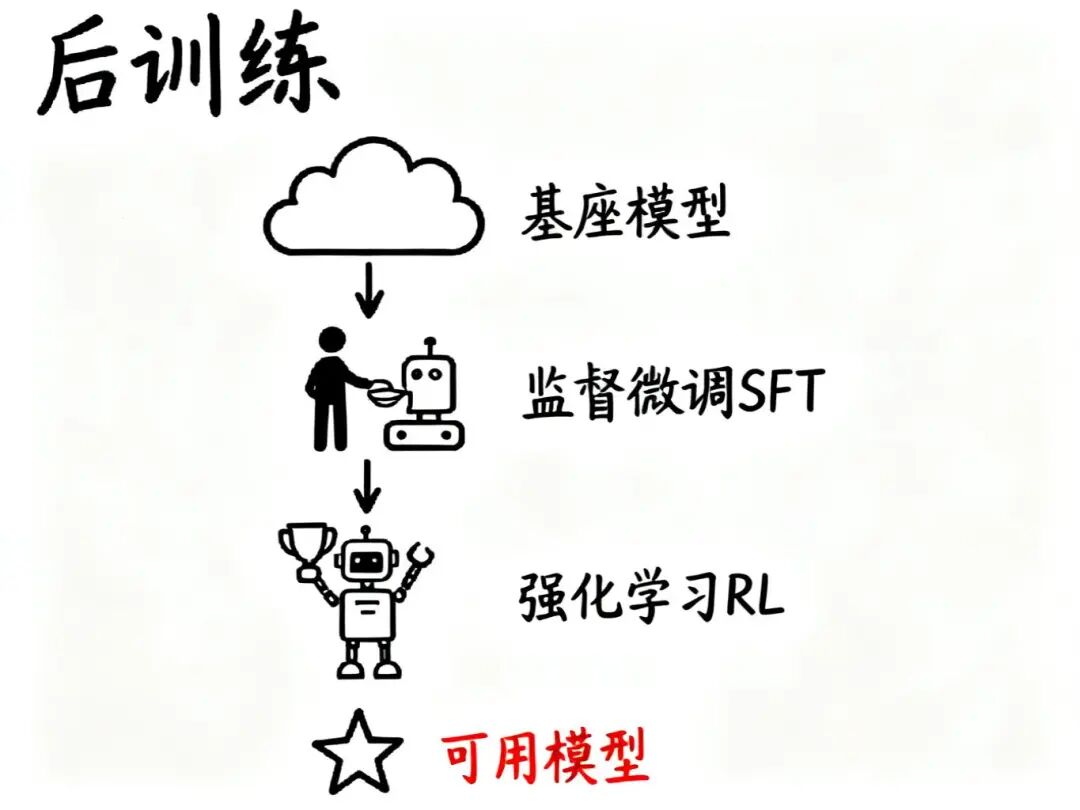 要把基座模型变成能用的产品,需要进行后训练(Post-training)。这个阶段包括两个关键步骤:监督微调和强化学习。