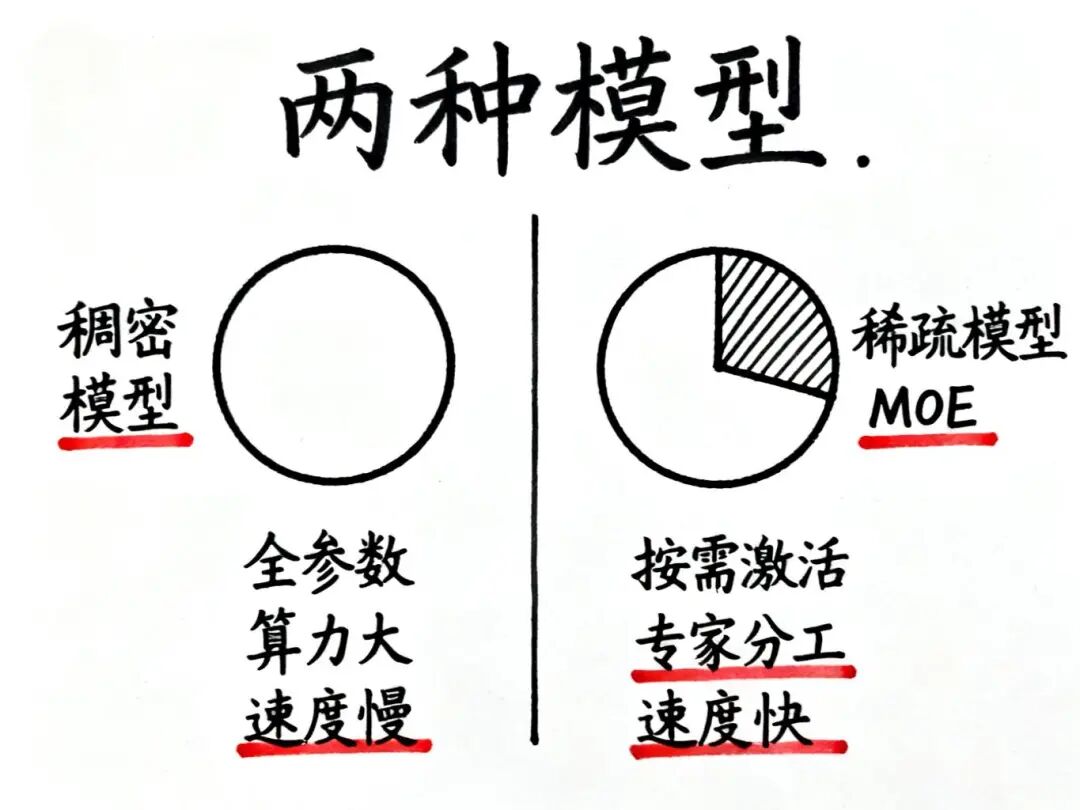 稀疏模型则更像"理性派",它会根据问题的类型,只激活相关的一部分参数。比如问数学题就调用"数学专家",问历史就找"历史专家"。这种按需调用的方式就是MOE(混合专家模型),马斯克的Grok和DeepSeek都采用了这种架构。