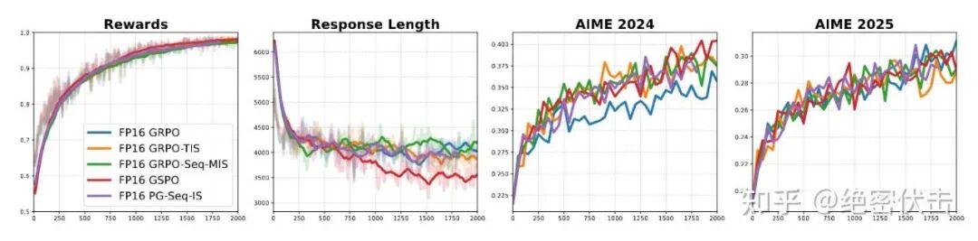 这一节主要探讨了当底层精度切换为 FP16 后,那些原本表现各异的强化学习算法(如 GRPO,TIS,MIS 等)在性能上发生了什么变化。