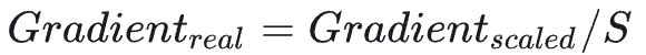 - 缩小(Unscaling):在利用梯度更新权重之前,将梯度除以 S,还原其真实的数值大小。