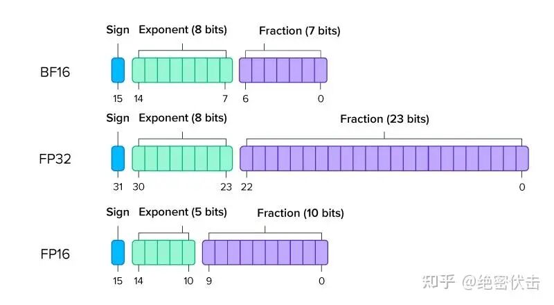 BF16(bfloat16)由 Google 提出,它使用 8 个指数位——与 32 位的 FP32 格式相同——但仅提供 7 个尾数位。