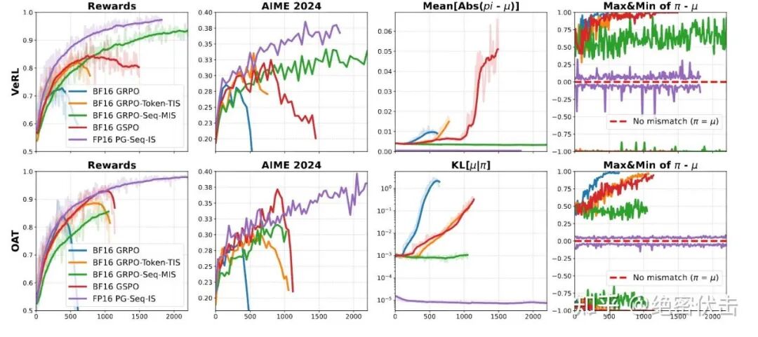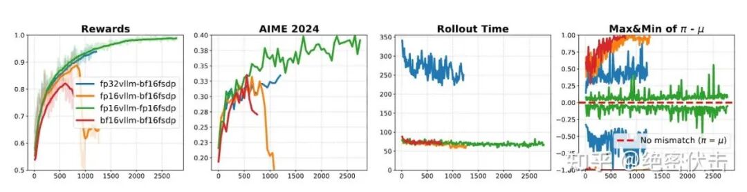 - FP16 的优势:FP16 训练所展现出的不匹配程度远低于任何 BF16 方法,这种内在的稳定性解释了为什么简单的策略梯度在 FP16 下能胜过复杂的算法。