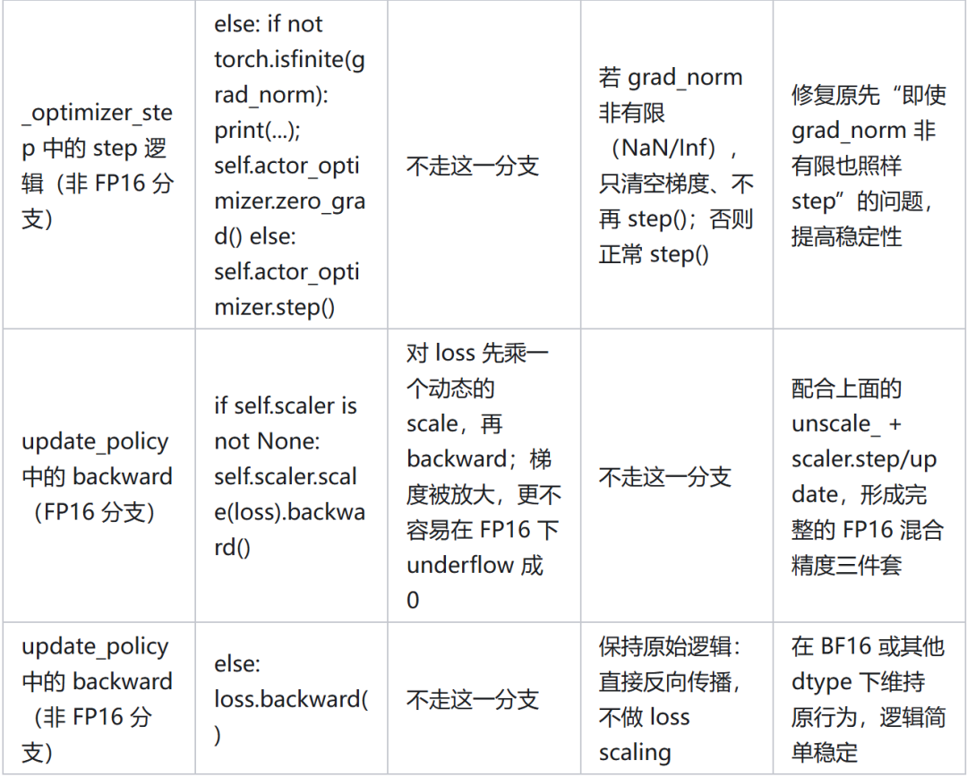 - VeRL 波动:即使在 FP16 下,VeRL 也更容易出现偶尔的数值尖峰。