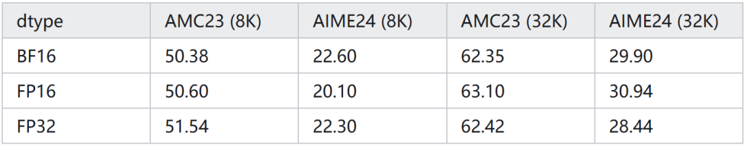 - FP16:训练非常稳定,最终达到了 65.6% 的准确率,这一成绩与专门针对数学优化的 SOTA 模型(如 Qwen-2.5-Math-7B)相当。