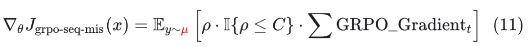 **序列级 MIS 修正(GRPO-Seq-MIS):**使用整个序列的概率比如下进行掩码过滤: