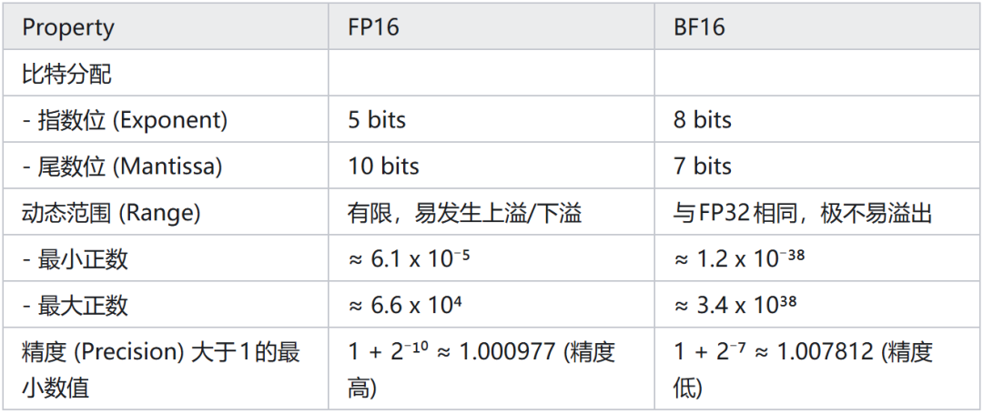 **结论:**FP16 的精度是 BF16 的 8 倍(2^3)。在深度神经网络中,数值会经过数以亿次的累加和乘法。精度的微小差异会在层与层之间被放大。