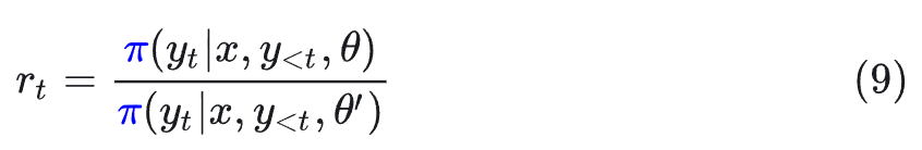 - 额外开销:为了计算上面的 p 或 p_t,模型需要额外进行一次前向传播(Forward Pass)来获取 π(y|x,θ’)的概率。