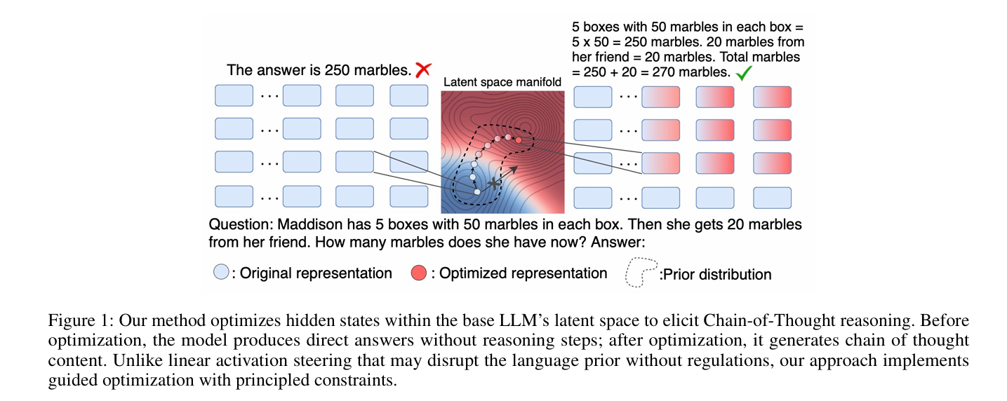 该研究针对基础大语言模型(LLMs)在多步复杂任务中推理能力不足的问题,提出一种基于梯度的表示优化方法,通过概率条件生成框架重构隐藏状态操纵问题,在平衡似然性和先验正则化的同时,引导隐藏状态向推理导向轨迹演进,既保留语言连贯性,又突破了现有线性激活引导方法的刚性约束与分布偏移缺陷。在数学、常识和逻辑推理基准测试中,该方法持续优于现有引导技术,为增强基础LLMs推理能力提供了理论严谨且高效的解决方案。
