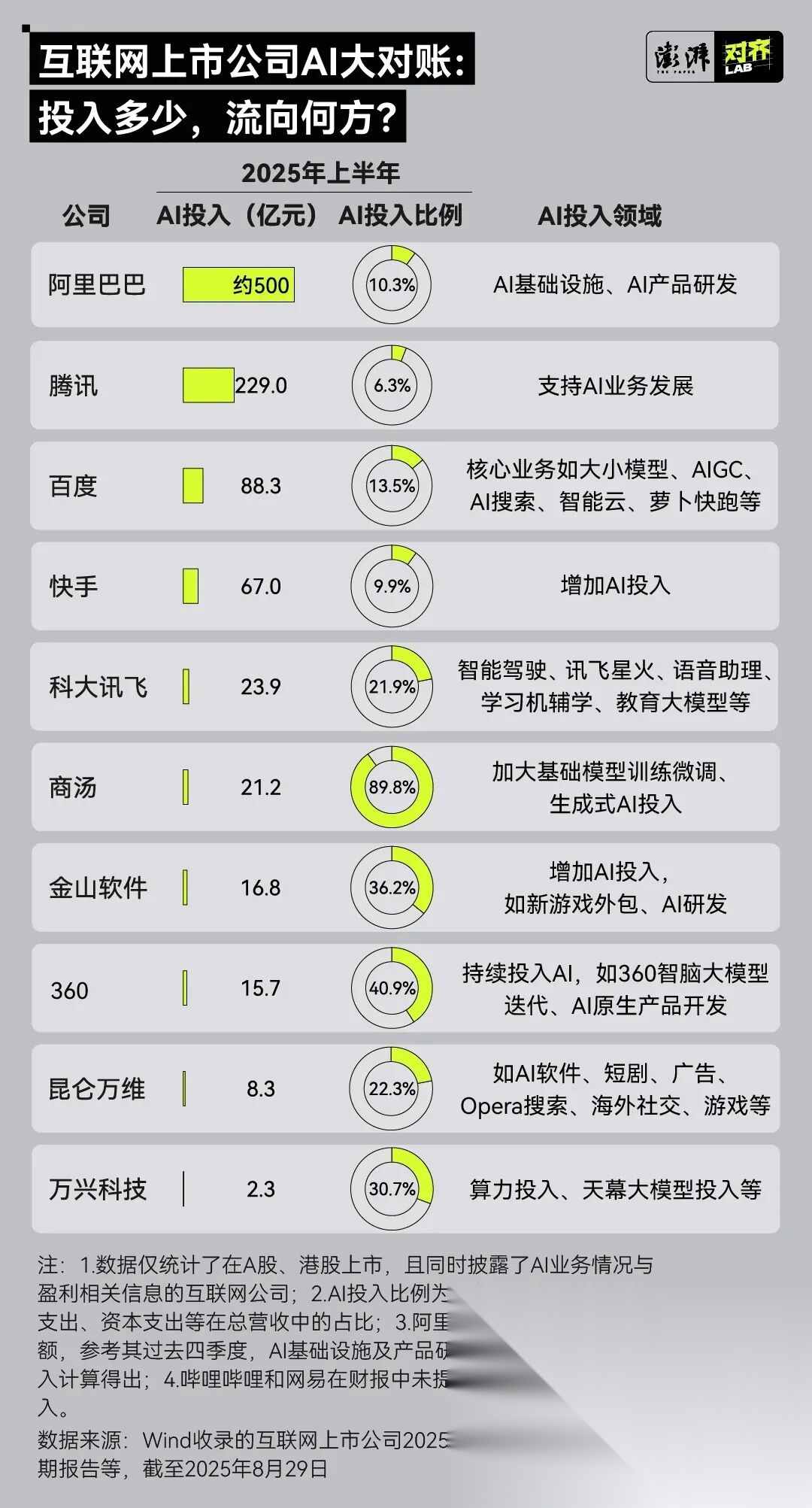头部企业的投入趋势同样十分明确。金山科技、万兴科技等公司的 AI 相关投入占比均已超过 30%,更激进的是商汤,2025 年上半年将近九成营收投入至 AI 研发,研发支出达到 21.19 亿元,体现了大模型时代的高强度投入要求与竞争门槛。