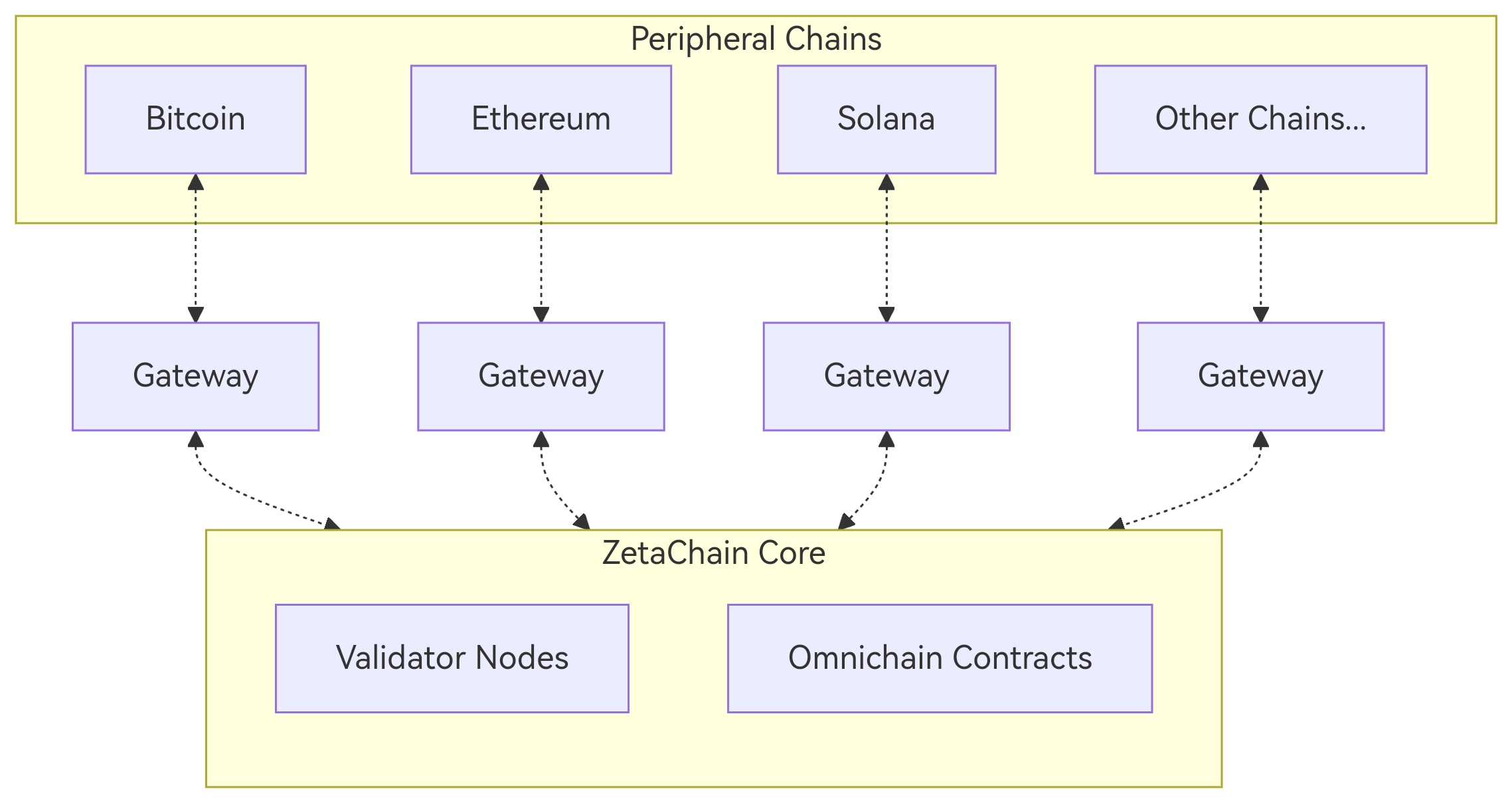 ZetaChain 中心 + Bitcoin / Ethereum / Solana 等外围链 + Gateway