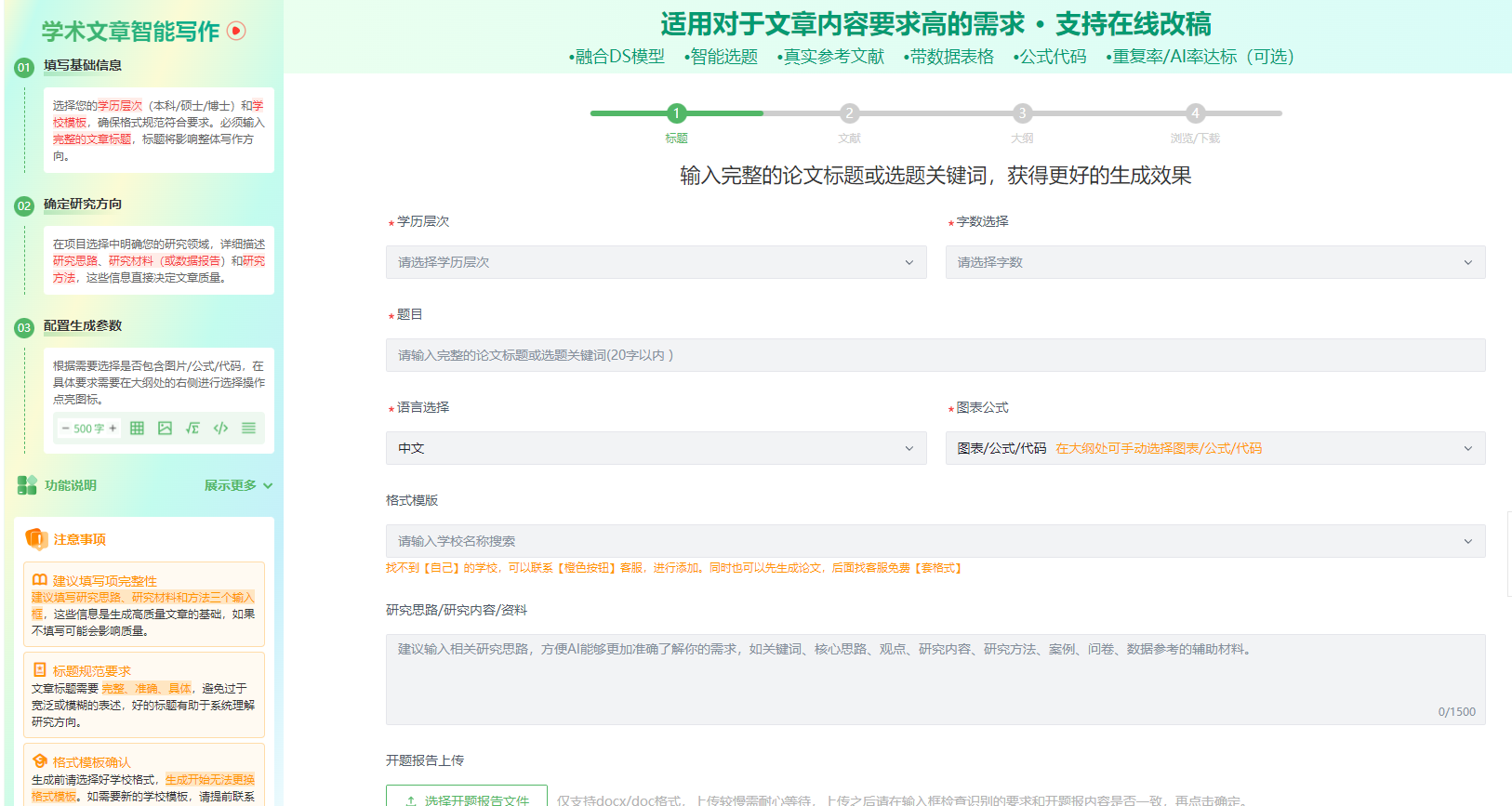 - 内容增强选项:支持勾选“含公式/代码”“重复率达标”等功能,适配理工科与合规性需求;