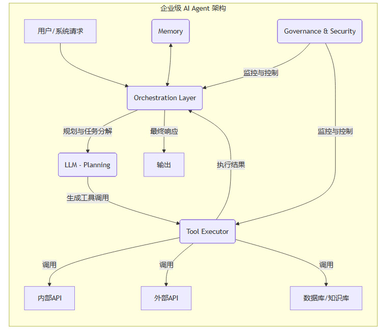 一个功能完备的企业级 AI Agent 系统,其架构远不止一个 LLM 调用。它至少需要包含以下几个核心组件。