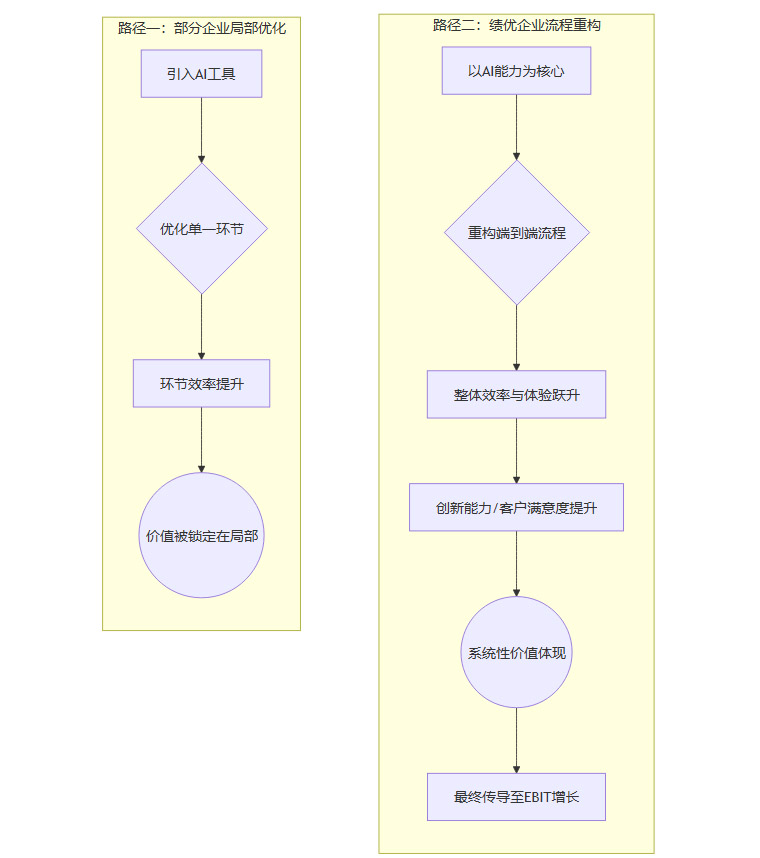 我们可以用一个简化的流程图来展示 AI 价值的两种不同实现路径。