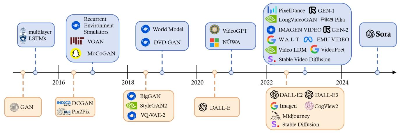 从2016年开始,生成式AI开始分化出**“图像生成”和“视频生成”两条技术支线**,各自在探索中突破: