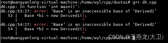 如下代码,有一个基类 Base,3个派生类Derived1,Derived2,Derived3,分别是 private 继承,protected 继承,public 继承。在 main 函数里,分别使用 new 来创建 3 个子类,将 3 个子类指针赋值给 Base 指针,private 和 protected 继承的时候,子类指针无法赋值给父类指针。