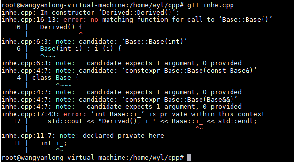 如下代码中,Base 是一个基类,Derived 继承了 Base 类。在 Base 类中声明了构造函数 Base(int i),这样就不会有默认构造函数 Base() 了。在 Derived 类构造时,没有显式调用 Base 的构造函数,那么就会调用默认构造函数 Base(),但是默认构造函数又不存在,所以在编译的时候就会报错。需要在 Derived 构造列表中对 Base 进行构造,比如 Base(10)。